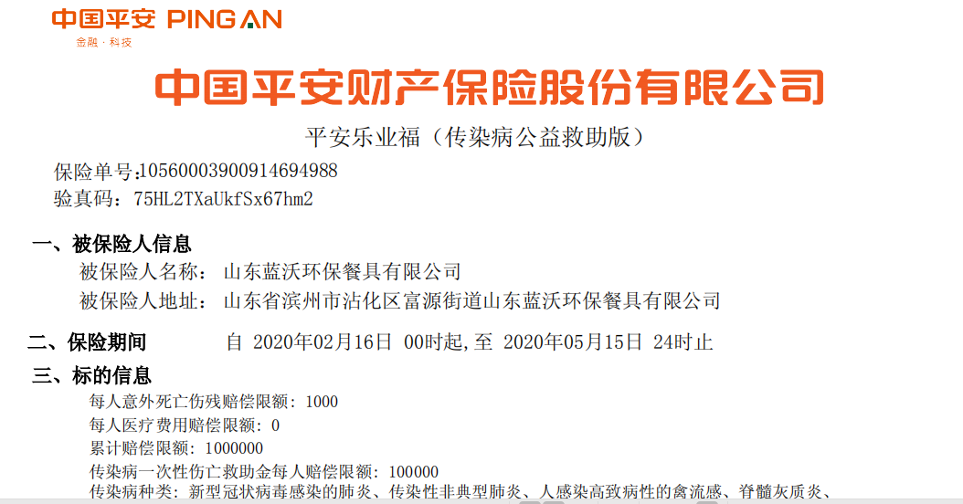 山东蓝沃环保餐具有限公司与2020年2月14日正式批准复工,在复工开始坚持以人为本,安全生产的理念,把人的安危放在首位,坚持做好各项防疫措施,严格执行复工方案,与此同时为每位员工免费提供了一份疫情保障保险,让各位员工可以安心上班,放心工作!