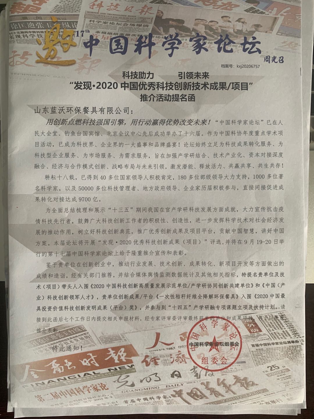 我司一次性秸秆纤维全降解环保餐具项目受邀参加2020中国科学家论坛