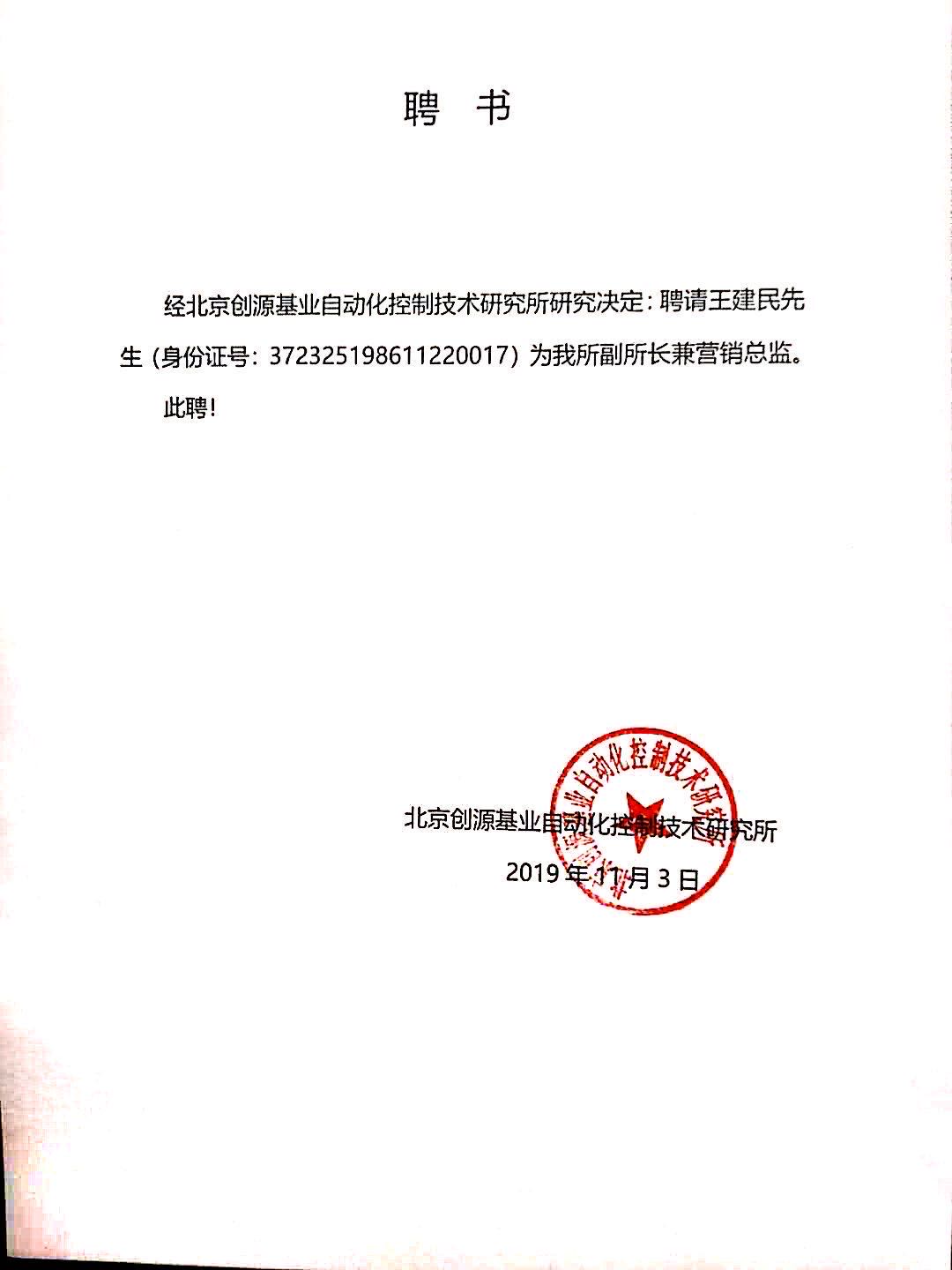 山东蓝沃环保餐具有限公司总经理王建民先生被北京创源基业自动化控制技术研究所聘请为苏所长兼技术营销总监。