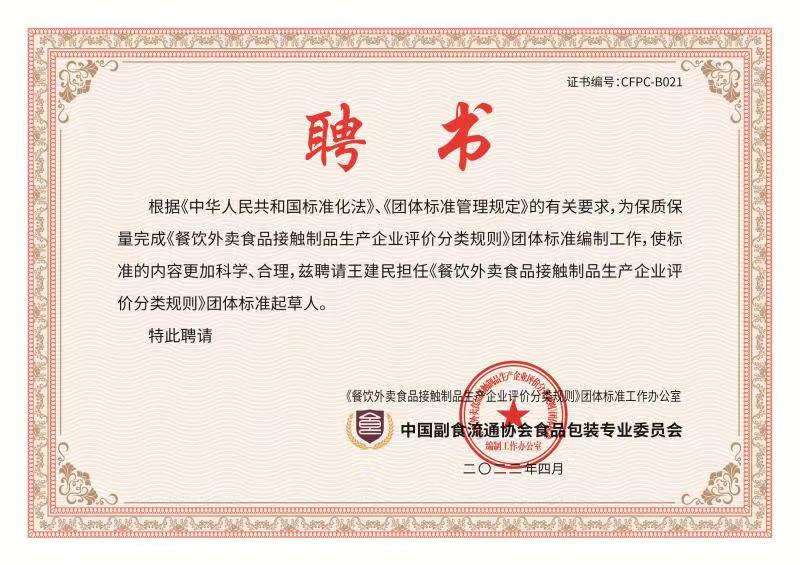 王建民受聘中国副食流通协会包装专业委员会外卖包装生产企业团标起草人