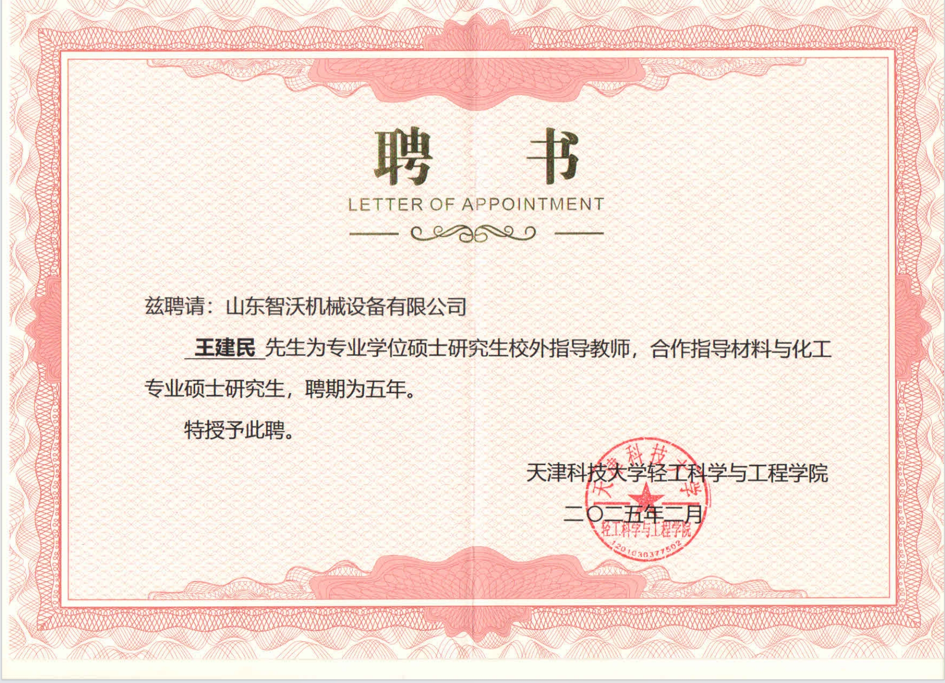 山东智沃机械设备有限公司董事长王建民受聘天津科技大学硕士生导师