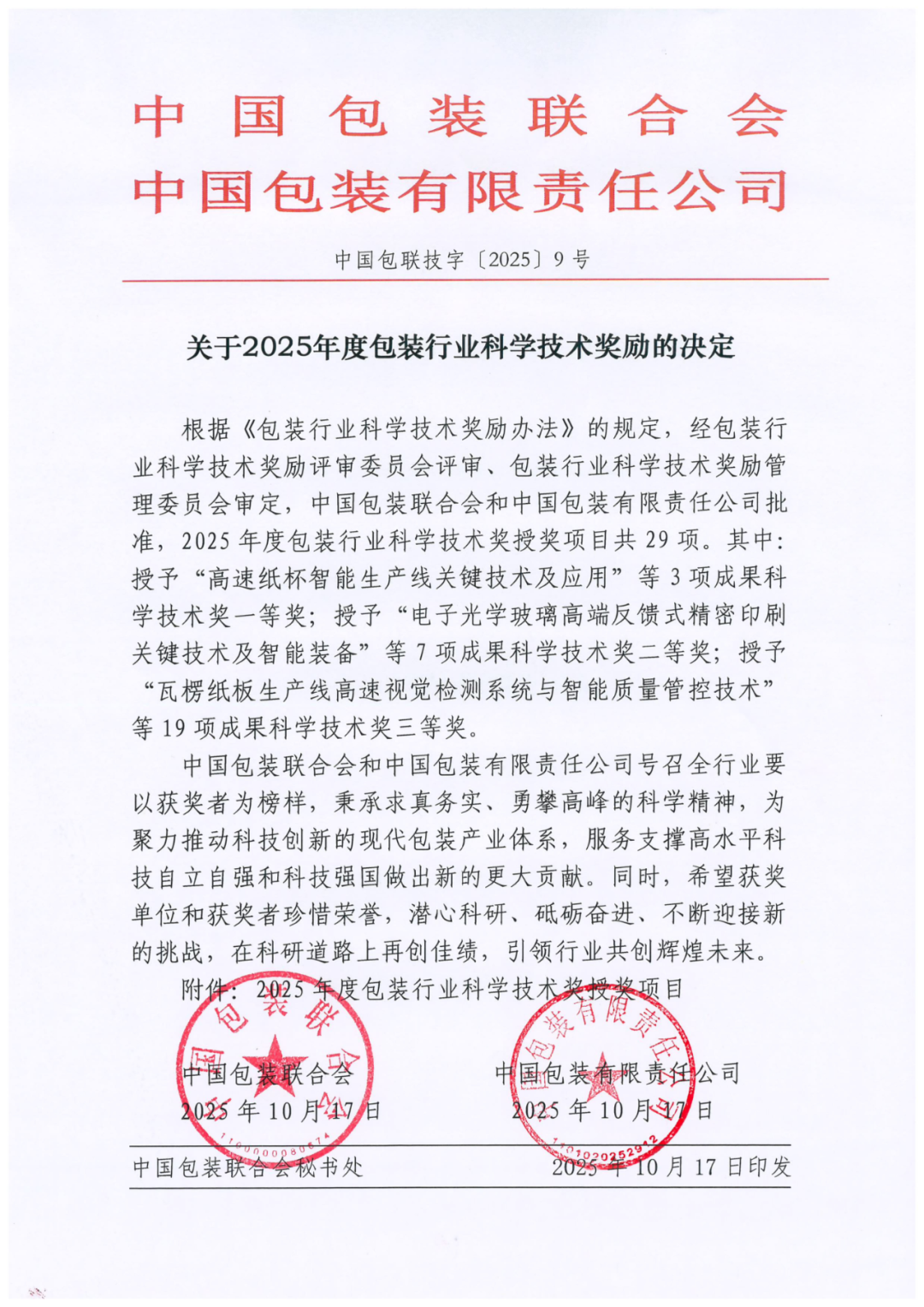 山东智沃机械设备有限公司荣获2025年度中国包装科学技术奖