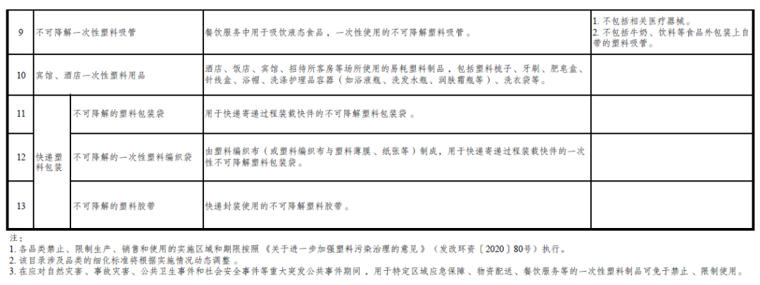 彼时发布的《意见》提出禁止、限制部分塑料制品的生产、销售和使用的具体时间表和大品类:禁止生产、销售的塑料制品:禁止生产和销售厚度小于0.025毫米的超薄塑料购物袋、厚度小于0.01毫米的聚乙烯农用地膜。禁止以医疗废物为原料制造塑料制品。全面禁止废塑料进口。到2020年底,禁止生产和销售一次性发泡塑料餐具、一次性塑料棉签;禁止生产含塑料微珠的日化产品。到2022年底,禁止销售含塑料微珠的日化产品。