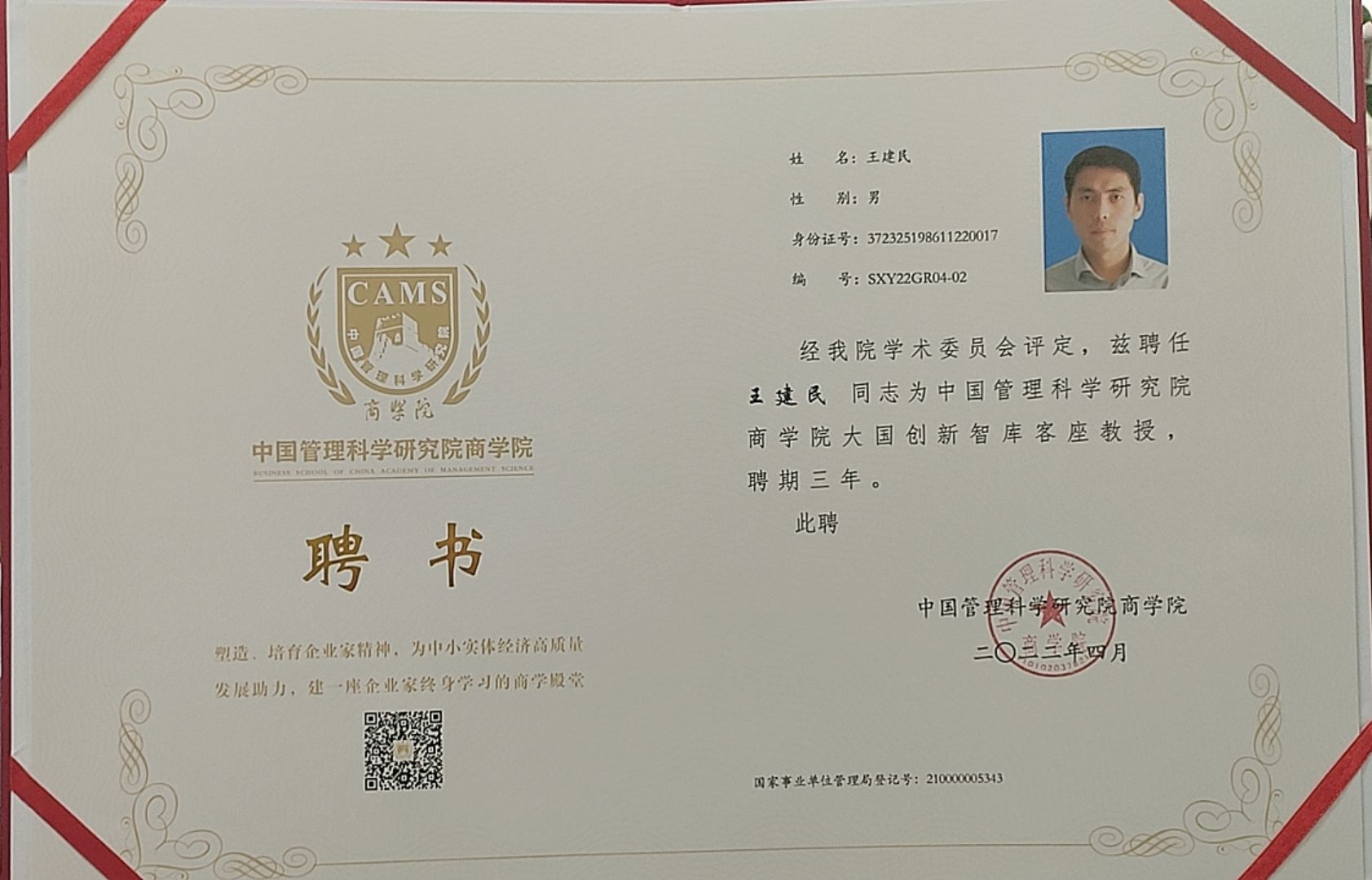 山东智沃机械设备有限公司董事长王建民受聘中国管理科学研究院商学院客座教授