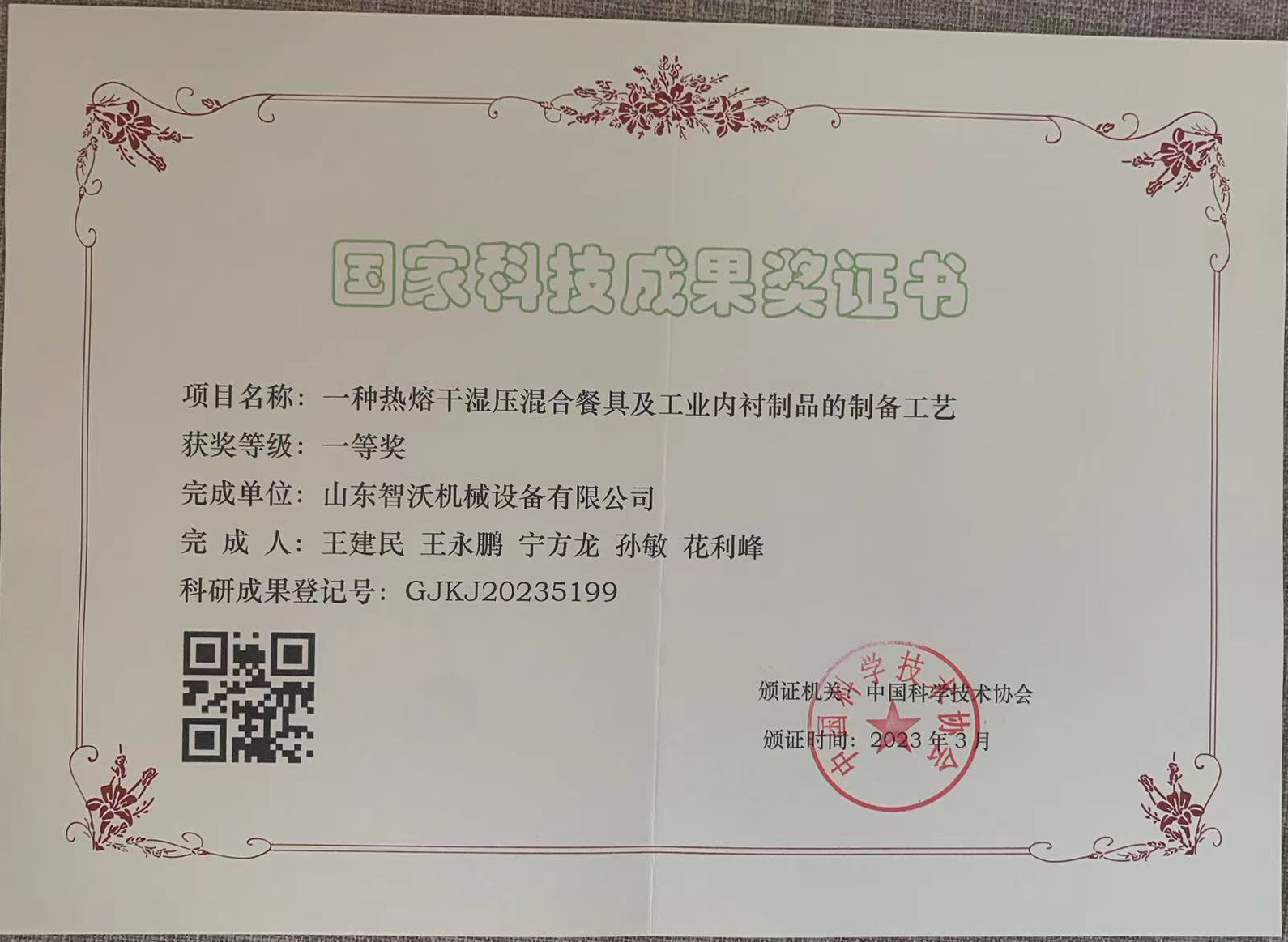 山东智沃机械设备有限公司董事长王建民带领公司技术团队研发的干湿压热熔技术获得中国科学技术协会一等奖成果证书。该技术完全颠覆传统行业的生产模式,生产效率很高,成本更低,对行业的发展产生了极大的推动意义!