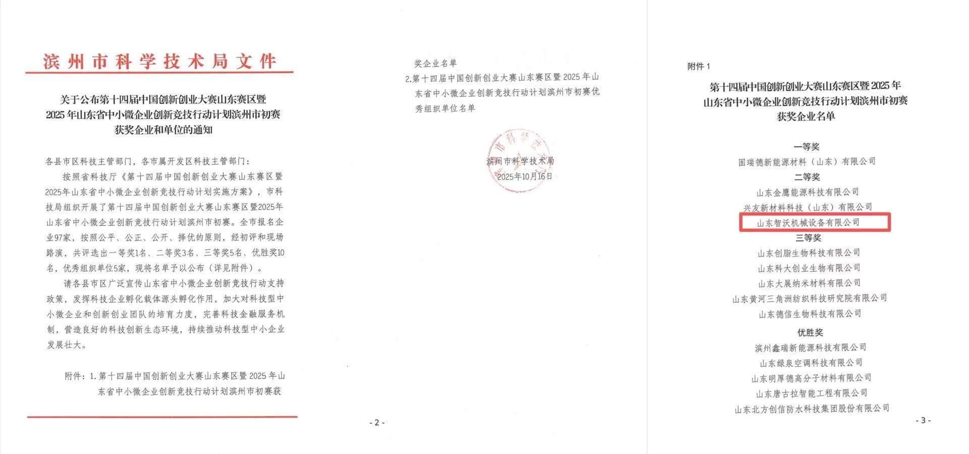 山东智沃机械设备有限公司在第十四届中国创新创业大赛山东赛区暨2025年山东省中小微企业创新竞技行动计划初赛中荣获二等奖